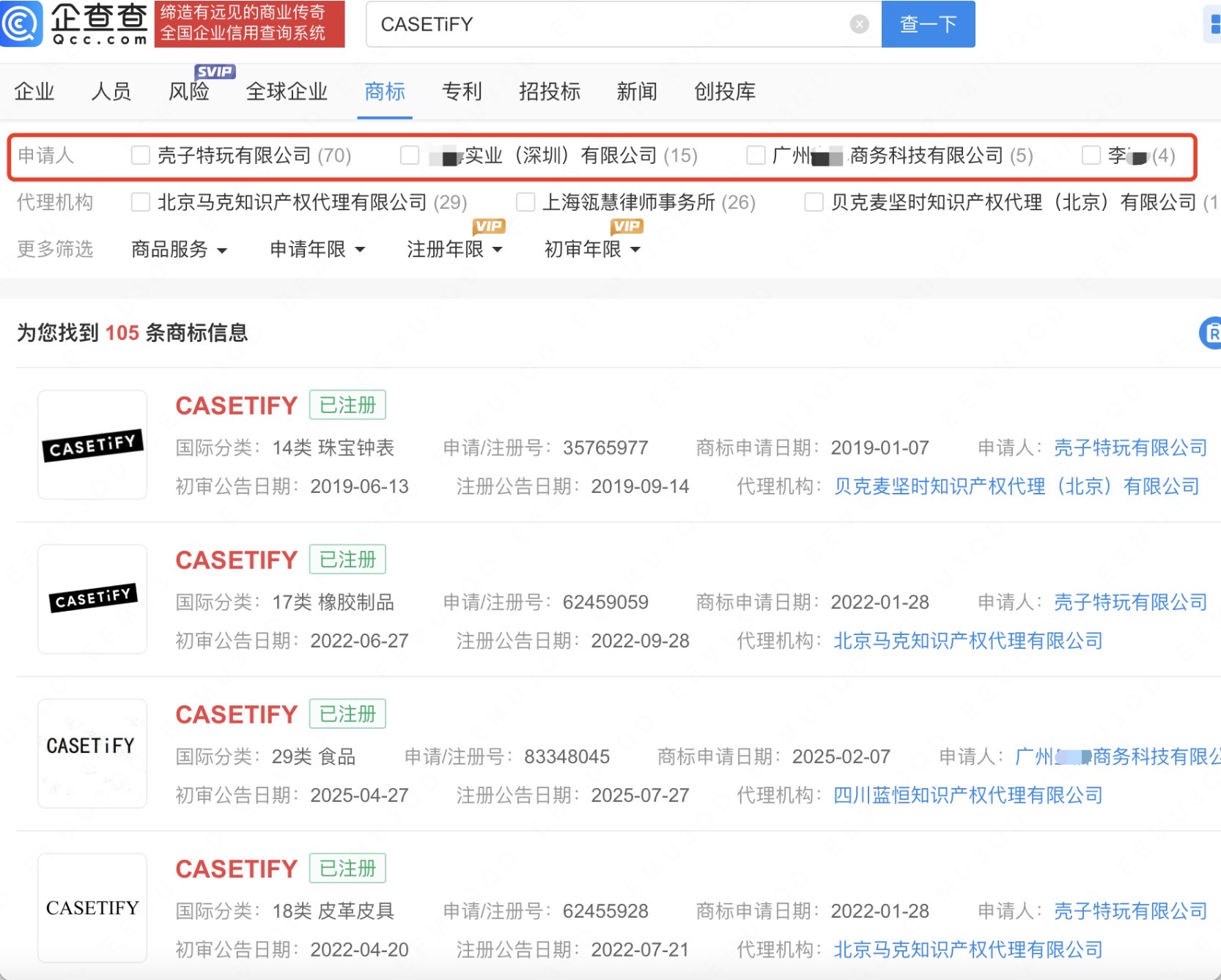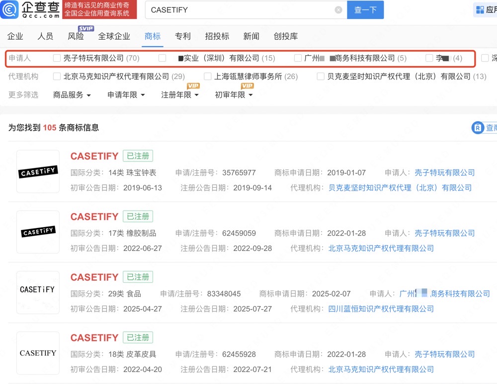 单价高达500元、年营收达36亿元的CASETiFY手机壳,正凭借“手机壳中的爱马仕”的定位成为一线中产消费者追捧的轻奢新宠。CASETiFY官网显示,其关联公司为壳子特玩电子商务(上海)有限公司。壳子特玩电子商务(上海)有限公司成立于2021年,法定代表人为陈德威,注册资本150万人民币,由壳子特玩电子商务(深圳)有限公司全资持股。此外,“CASETiFY”“CASETIFY”已被申请注册为商标,申请人包括壳子特玩有限公司、某实业(深圳)有限公司等,国际分类涉及珠宝钟表、食品等,上述商标状态多为已注册。