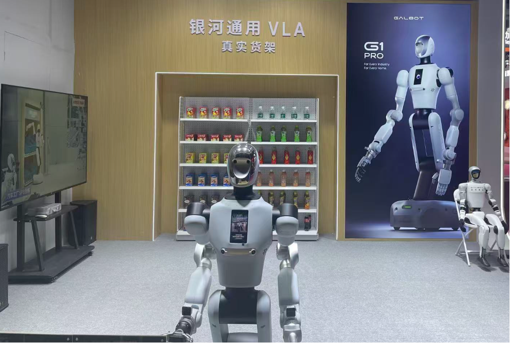 在面向中小企业服务的移动智企展区,有搭建的无人药店、无人值守小店等实景化平台,银河通用机器人则是在此参展演示。